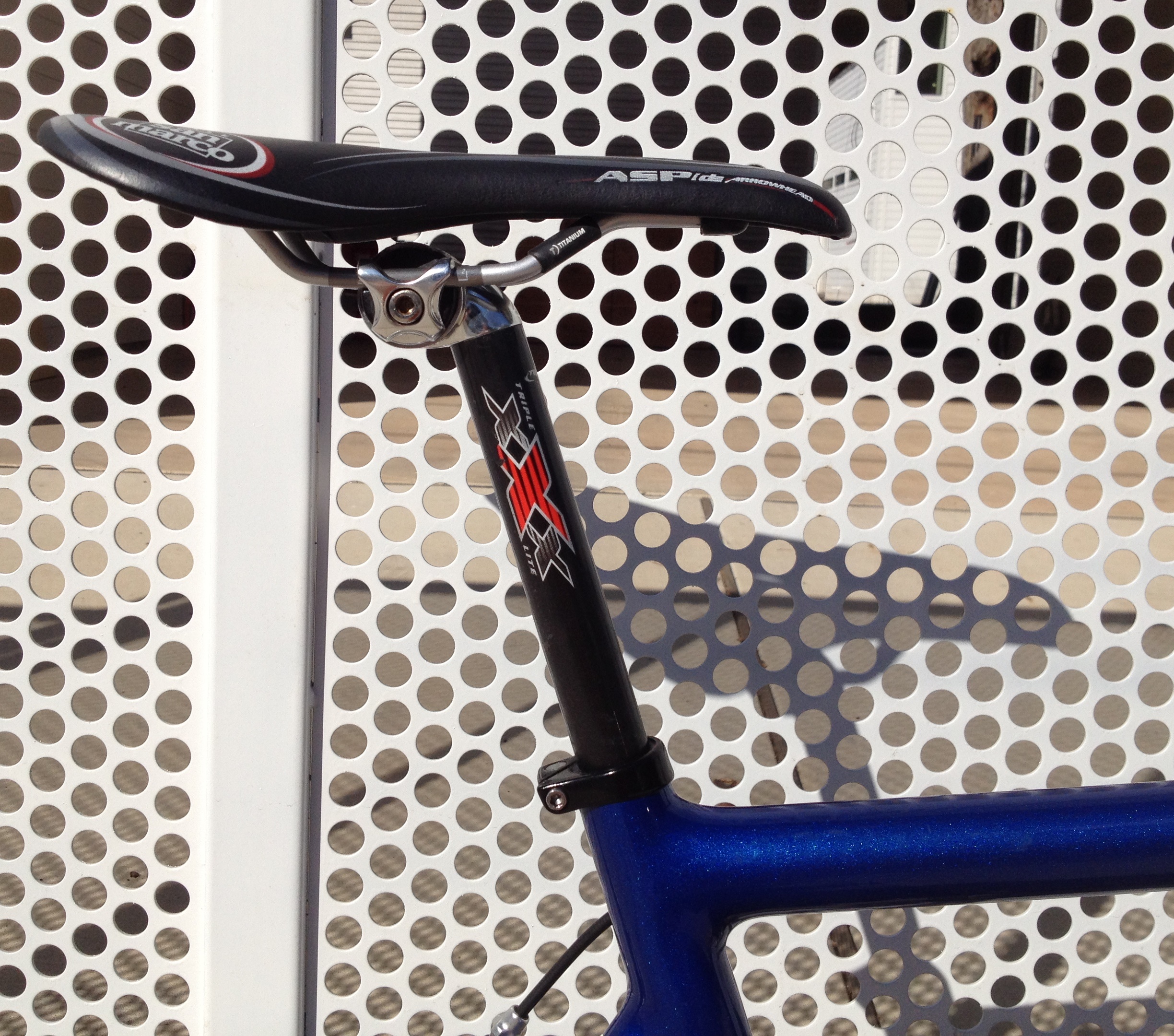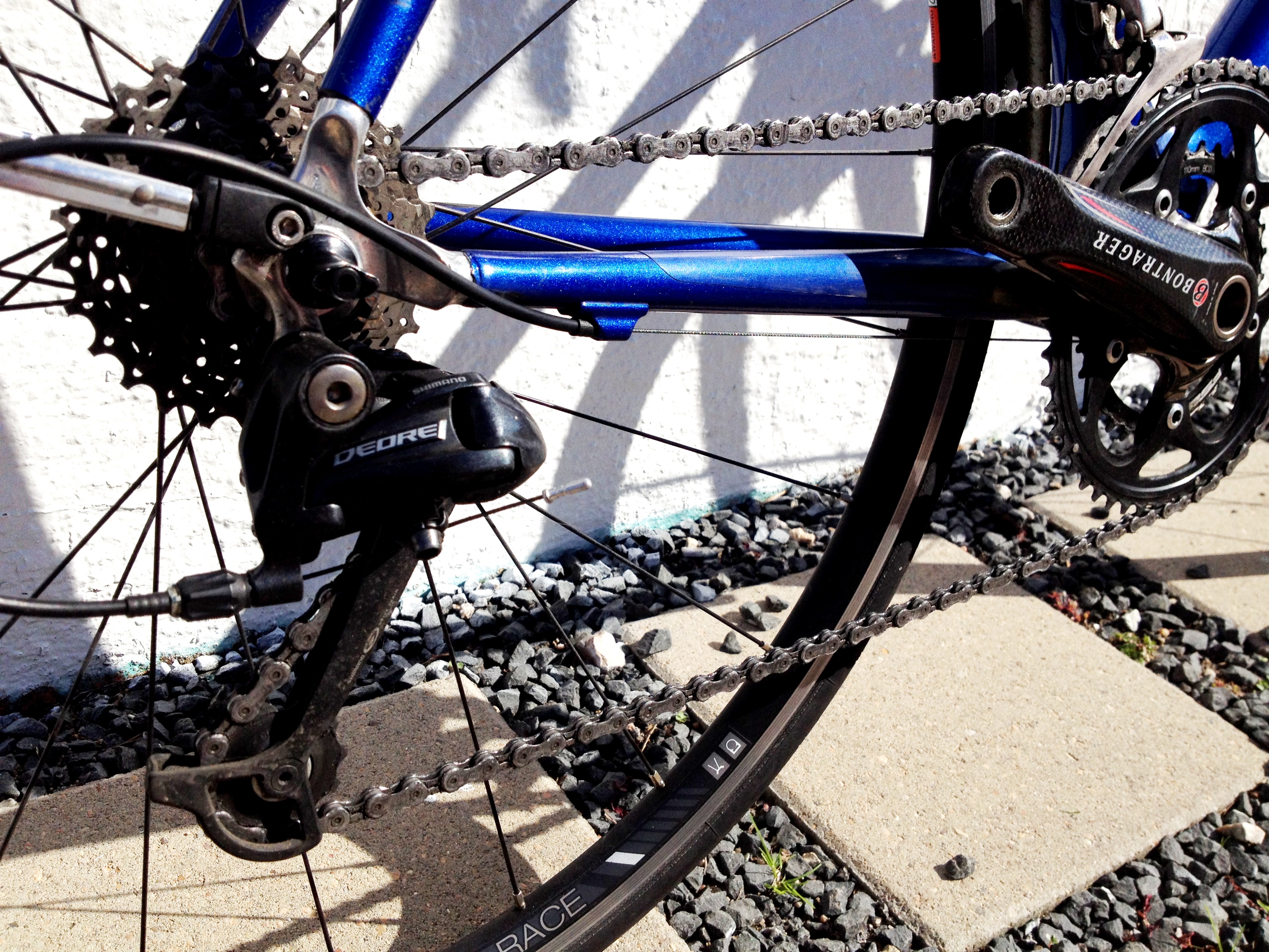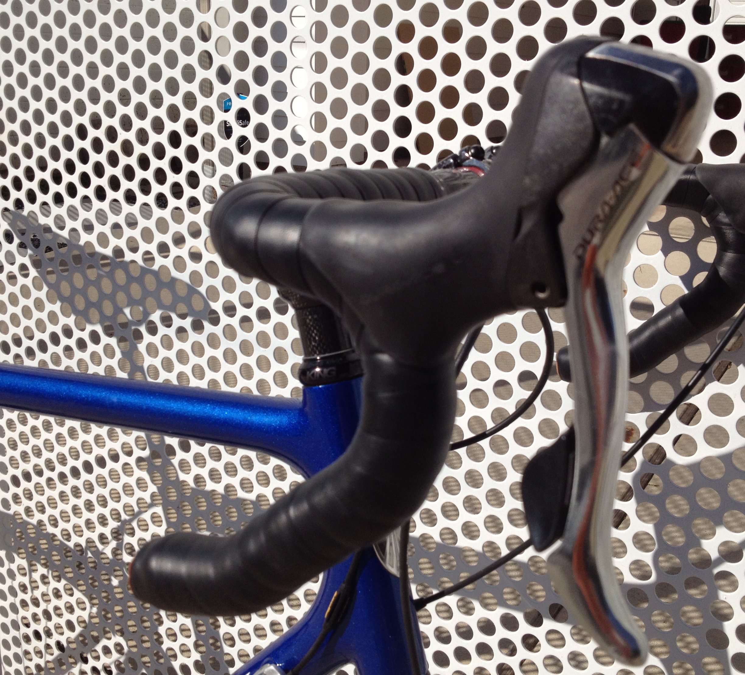 Shimano Dura Ace shifters & front derailleur (recently swapped out original Dura Ace rear derailleur to a new, longer cage Deore to allow a larger cassette range–for even better mountain riding)